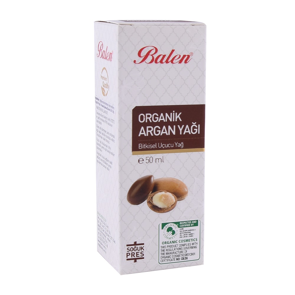 İçindekiler: Argan Yağı ürünü içerisinde; Soğuk Pres yöntemiyle elde edilmiş Argan Yağı bulunmaktadır. Kullanımı: Argan Yağı kullanılışı; Haricen cilde masaj yapmak suretiyle kullanılabilir. Yan Etkileri: Argan Yağı Ürününün Bilinen yan etkisi bulunmamaktadır. Balen Argan Yağı 50 ML Ürünü bitkisel üründür, kesinlikle ilaç değildir. Muhafaza ve Uyarı: Balen Argan Yağı Ürünü üzerindeki saklama şartlarına uyarak serin kuru rutubetsiz ortamda direkt güneş ışığından ve çocukların ulaşamayacağı yerde saklayınız.