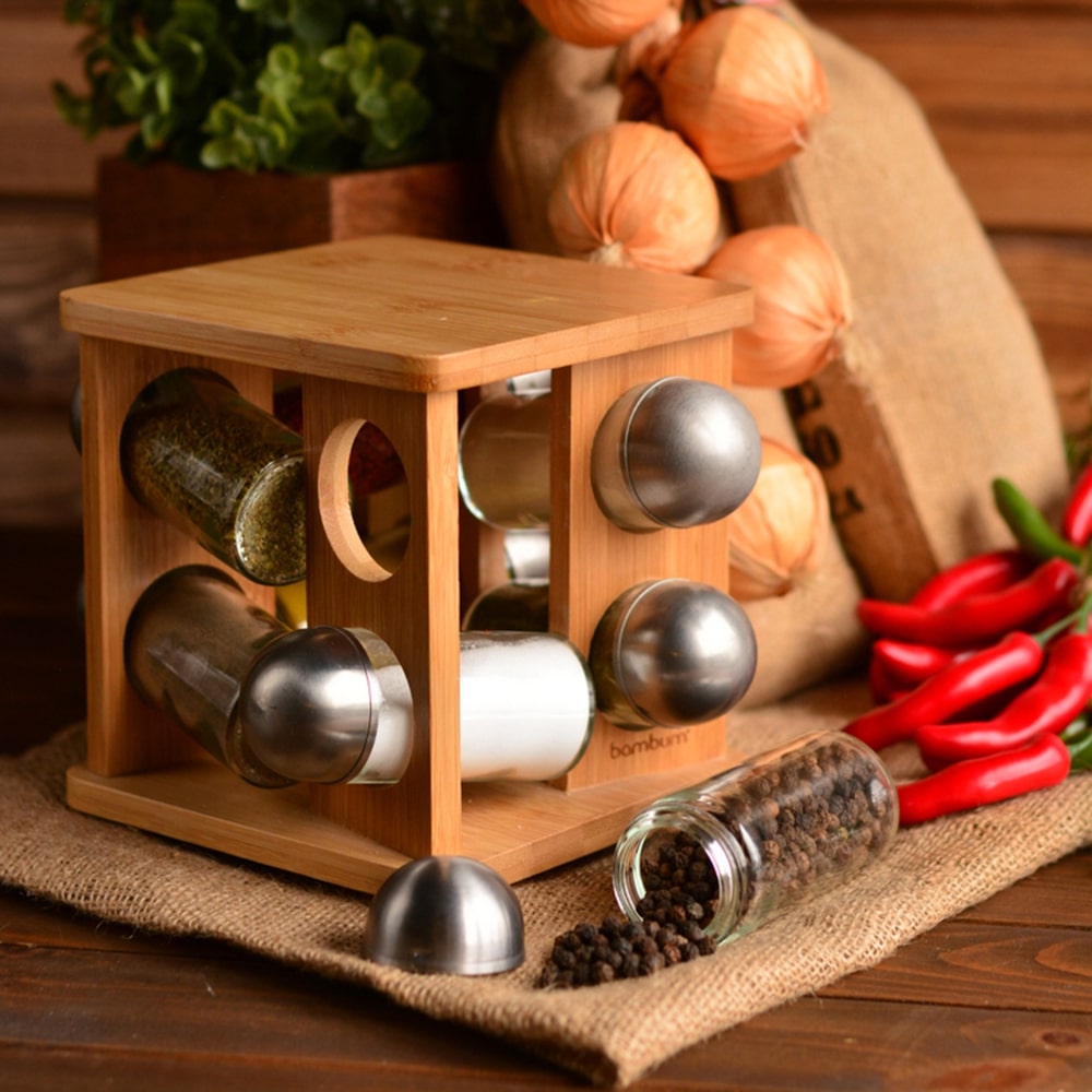 Bambum Fonti Baharatlık mutfağınızın vazgeçilmezi olacaktır. Üzerinde 8 adet farklı baharatlık bulunması ve 360 derece kendi etrafında dönebilen mekanizması sayesinde tüm baharatlık ihtiyaçlarınıza şık ve sağlıklı bir çözüm olacaktır.Ürün Boyutları:15x15x16.5cm