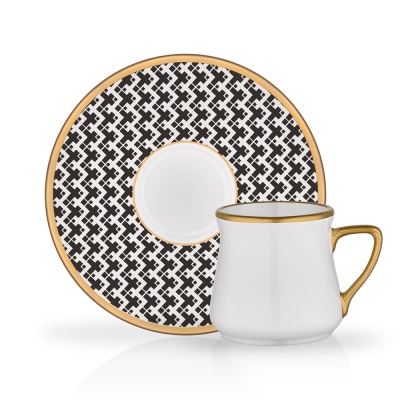 Set of 6 60 cc matt gold rimmed and decorated ceramic mirra cups.