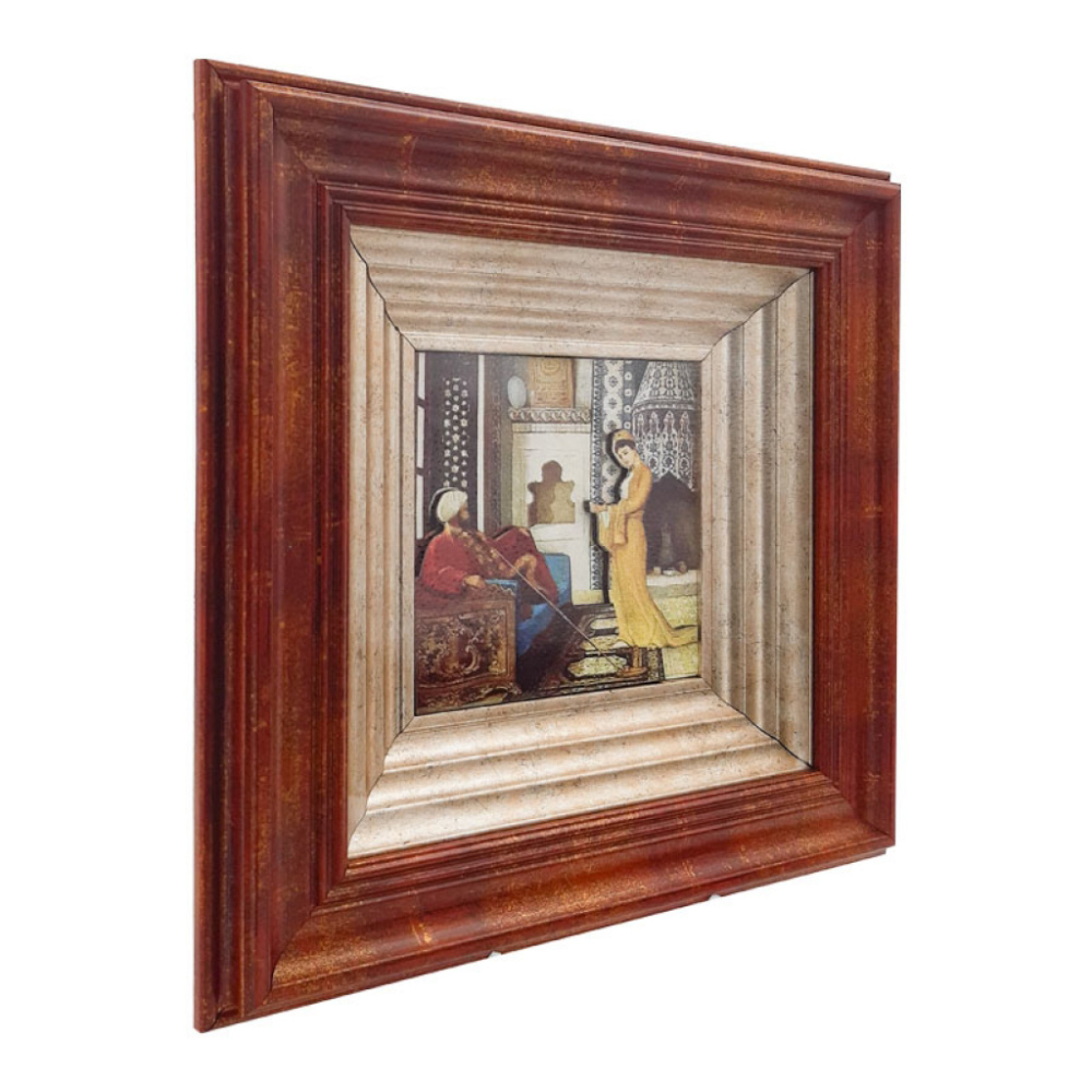 - تم استخدام إطار خشبي انتيكا مصفح بعرض 2.5 سم وأبعاد 35 × 35 سم بواجهة زجاجية.